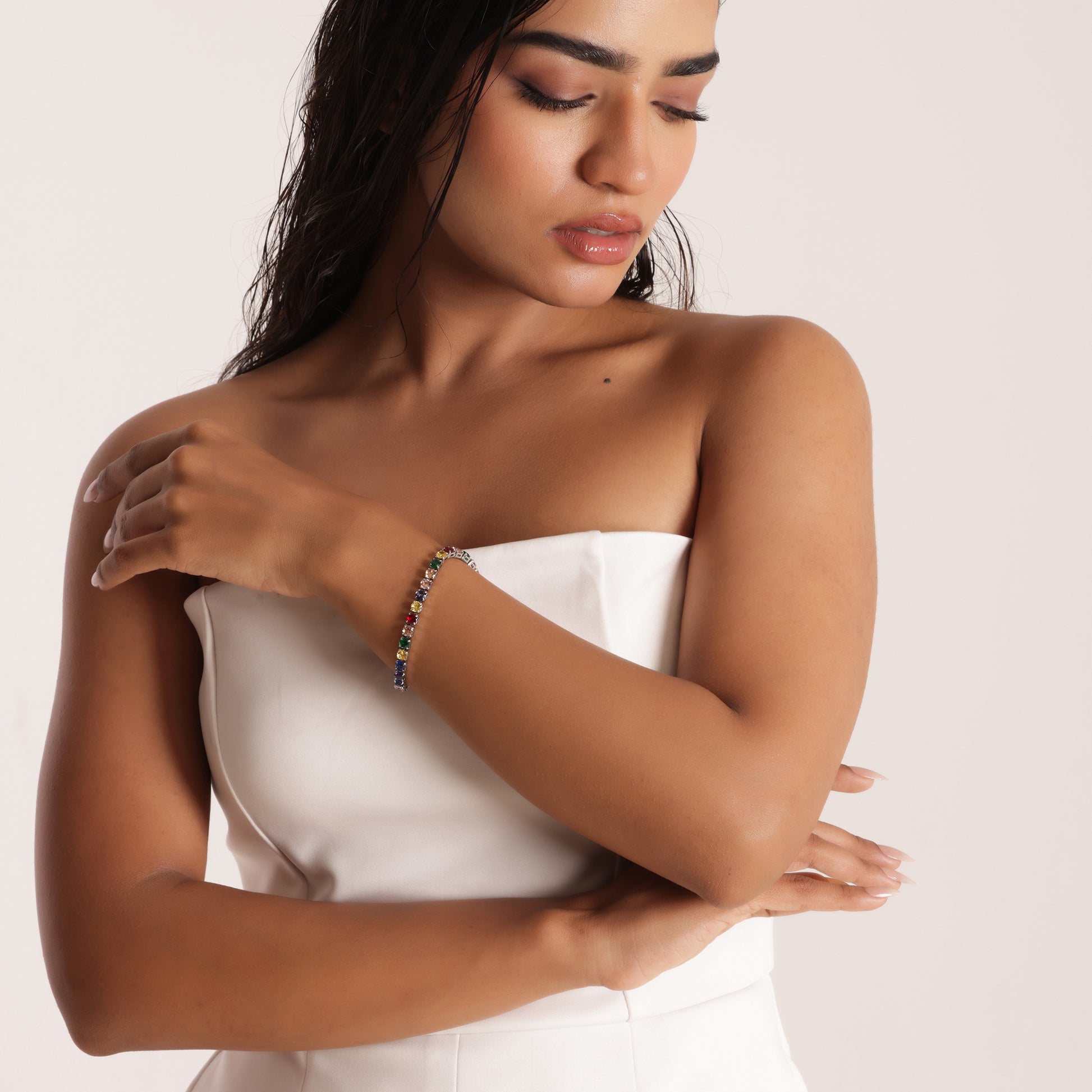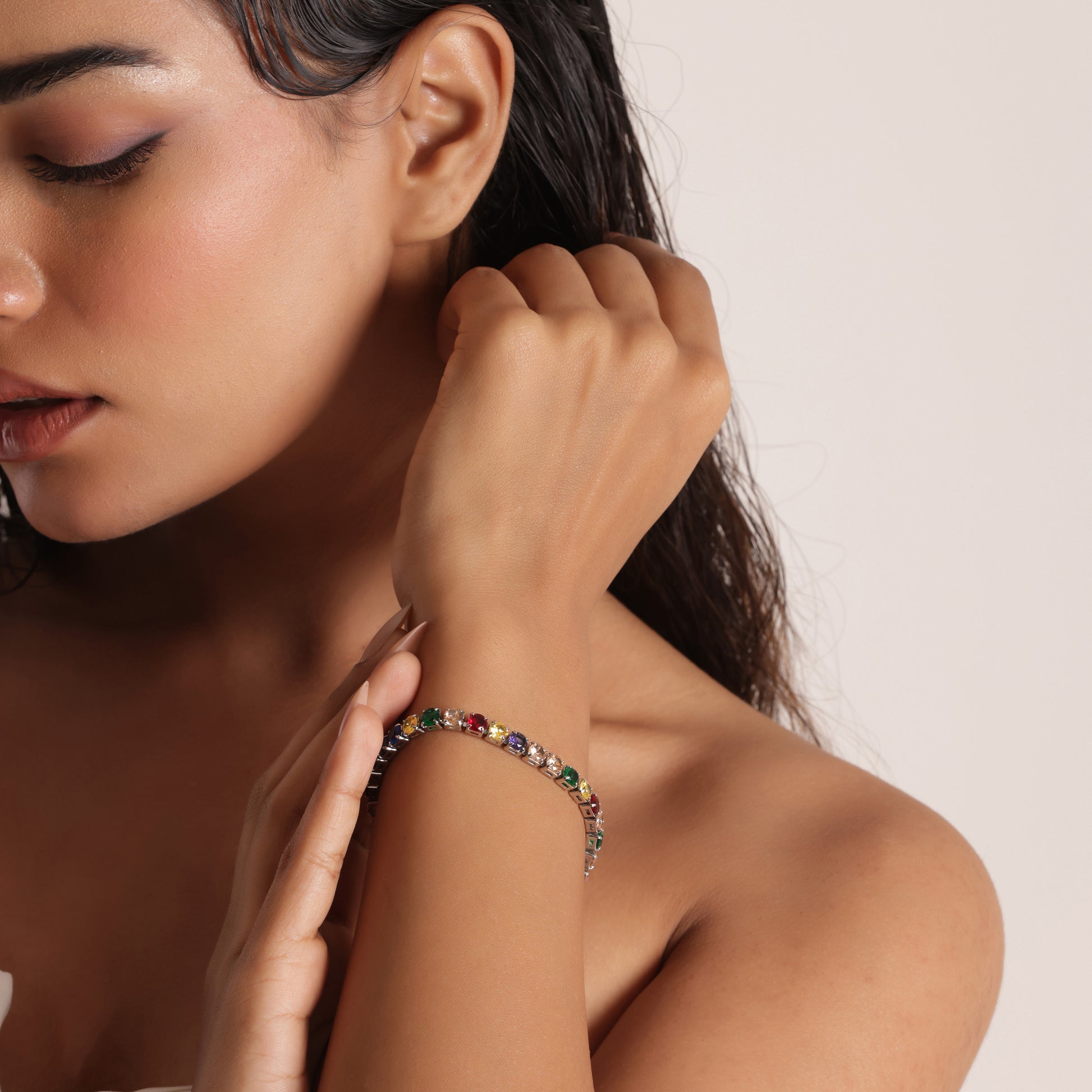 5mm Round Cut Multicolored Tennis Bracelet features vibrant multicolored stones in a sleek 18 cm design. Crafted with premium 316L plating, it is anti-tarnish, waterproof, and sweatproof, ensuring lasting shine and durability β perfect for daily wear and festive occasions.