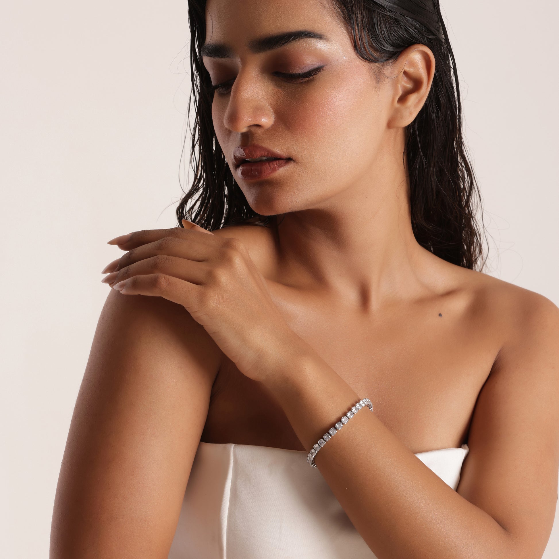 5mm Round Cut Tennis Bracelet features brilliant round-cut stones in an elegant 18 cm design. Crafted with premium 316L plating, it is anti-tarnish, waterproof, and sweatproof, ensuring lasting shine and durability β€” perfect for daily wear and special occasions.