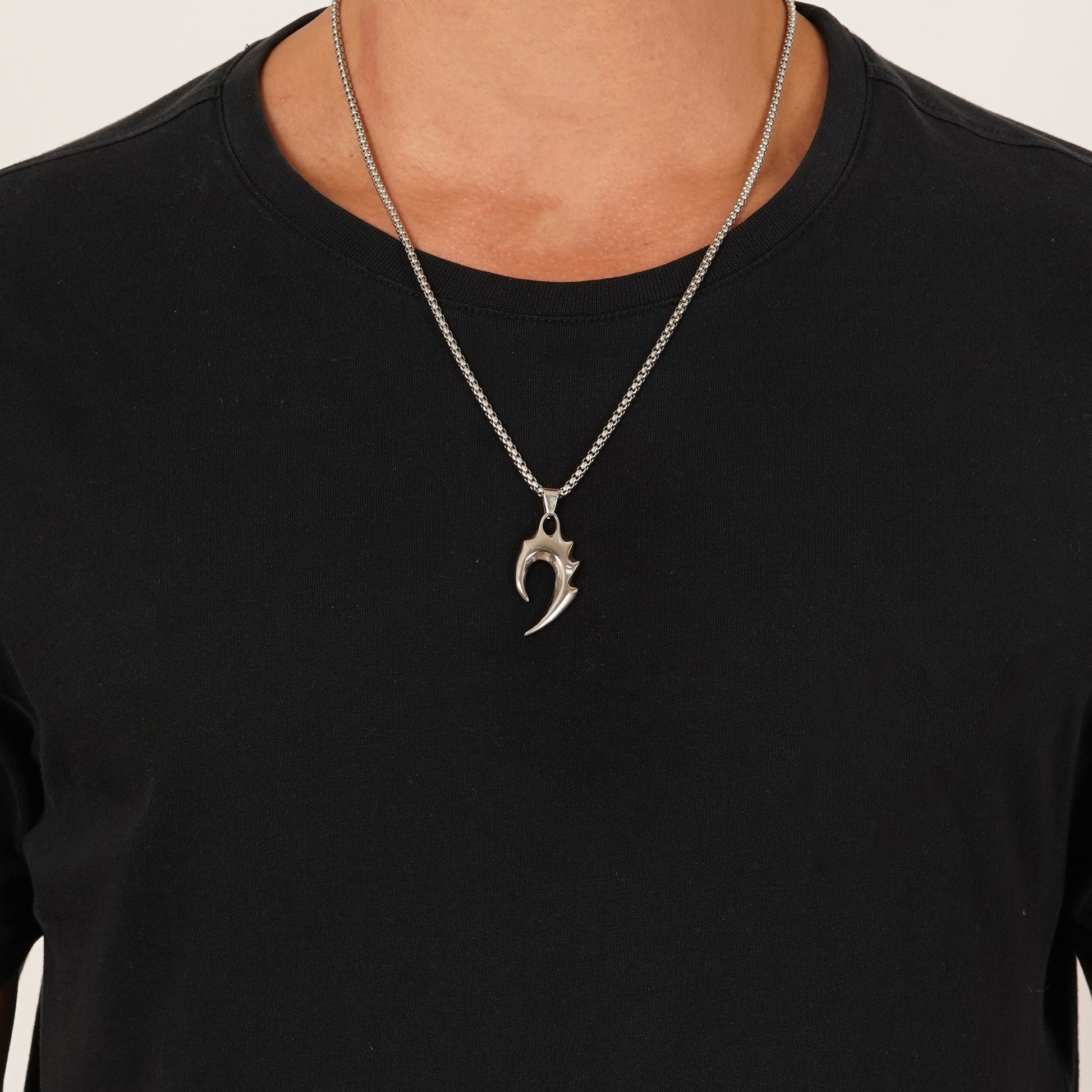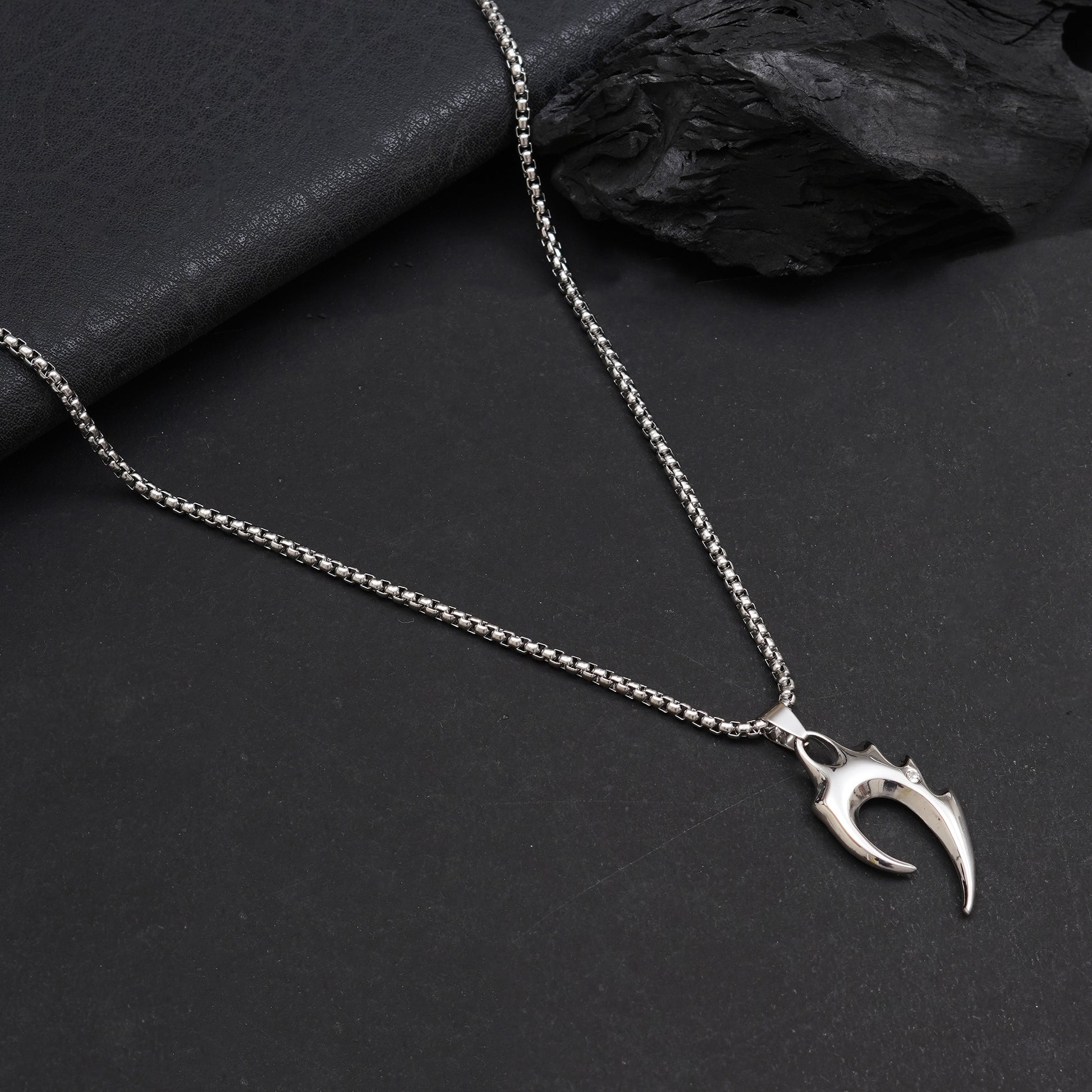 Wolf Tooth Silver Pendant with Chain features a sleek minimalist bar design paired with a 30 cm chain. Crafted from premium stainless steel with elegant silver plating, it is anti-tarnish, waterproof, and sweatproof, ensuring lasting shine and durability — perfect for daily wear and modern styling.