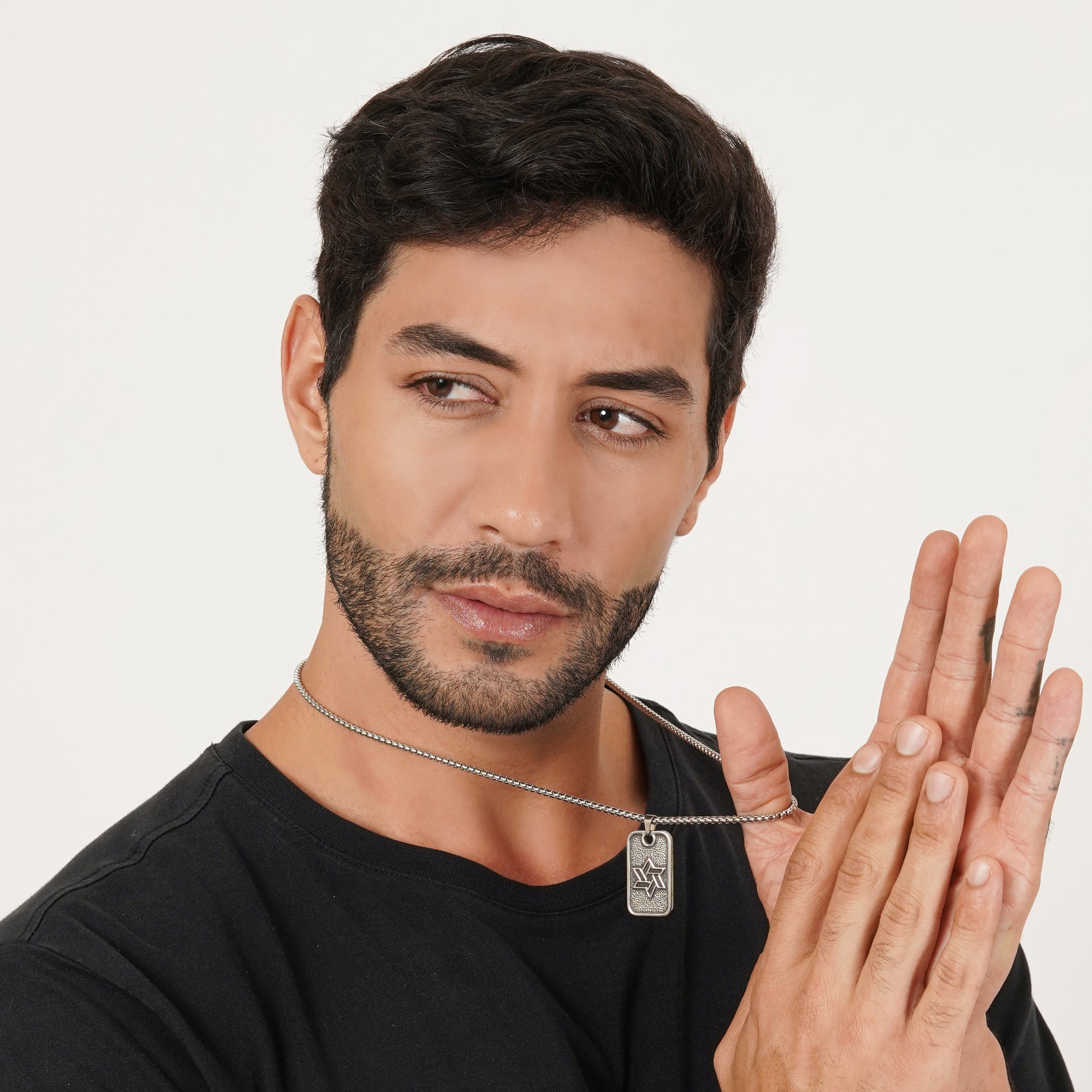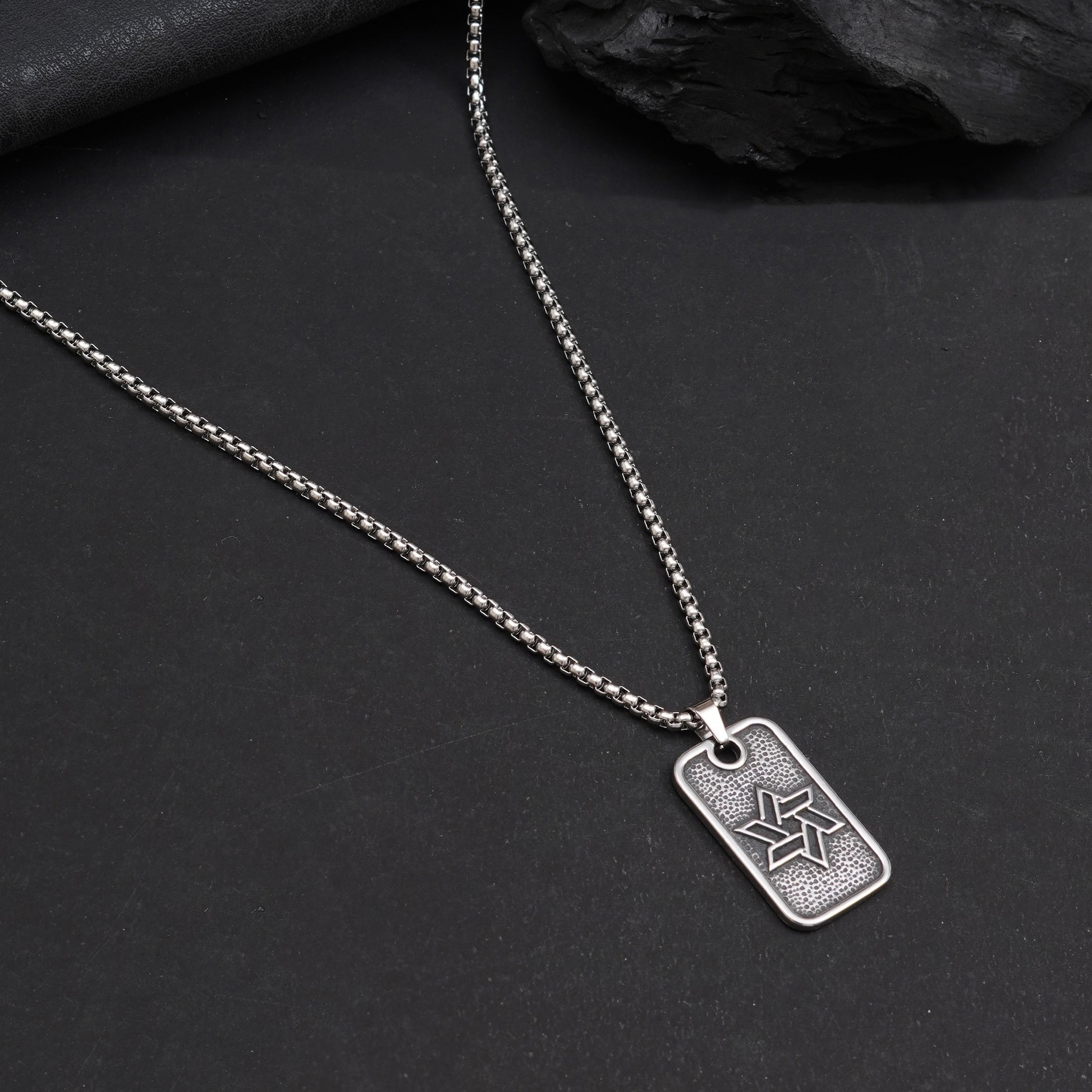 Hexa Silver Pendant with Chain features a sleek minimalist bar design paired with a 30 cm chain. Crafted from premium stainless steel with elegant silver plating, it is anti-tarnish, waterproof, and sweatproof, ensuring lasting shine and durability — perfect for daily wear and modern styling.